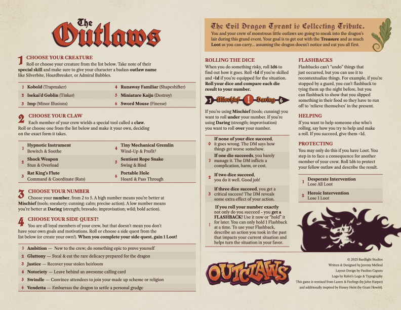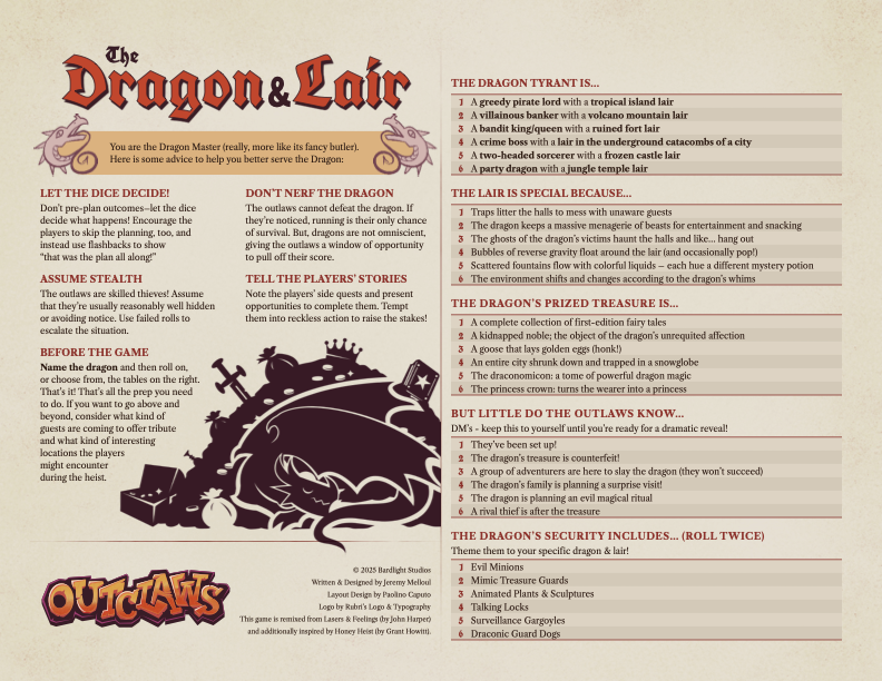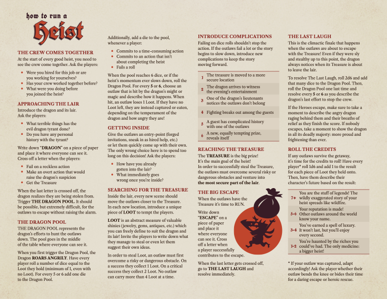 If you like Honey Heist, Lasers & Feelings, or Blades in the Dark - or just want to pull some crazy heists on tyrannical dragons - I think you'll find a lot to enjoy in this game!